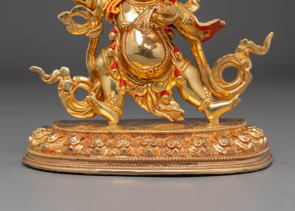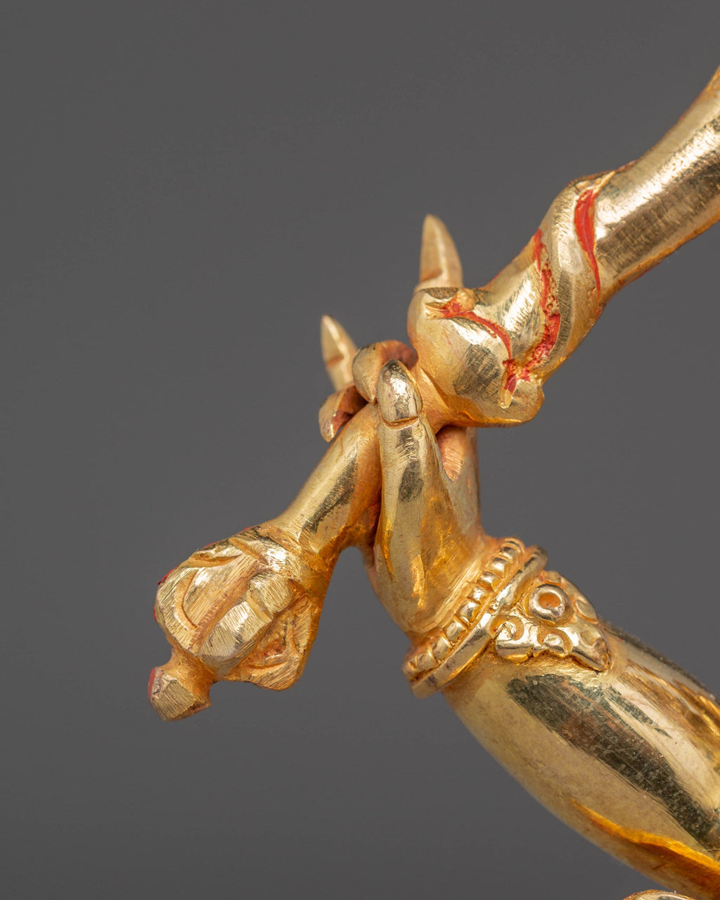 The Wrathful Black Manjushri Statue is a powerful portrayal of the Buddhist deity who wields the sword of wisdom to cut through ignorance. This sacred statue, made of copper with gold plating and beautiful acrylic paints, carries divine energy and is a powerful symbol of enlightenment, transformation, and protection. This Manjushri sculpture, with its intricate artistry and vivid detailing, is perfect for meditation rooms, spiritual altars, and holy settings.