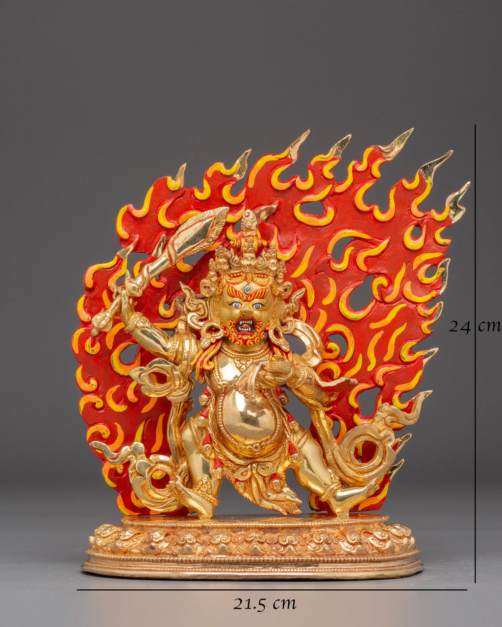 Standing 24cm tall, 21.5cm at the base, and weighing 2.29kg, this Black Manjushri statue is painstakingly made to depict his wrathful yet sympathetic demeanor. The keen expression, symbolic ornaments, and forceful posture symbolize the deity's role in eradicating ignorance and providing practitioners with clarity. This Buddhist statue has profound spiritual importance and serves as an inspiring centerpiece for individuals seeking wisdom, guidance, and spiritual enlightenment.
