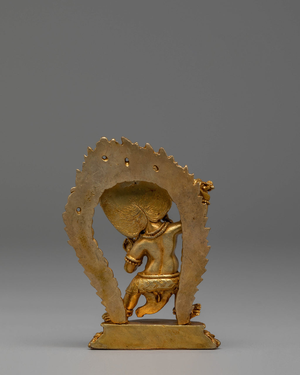 The Wrathful Bodhisattva Vajrapani Statue depicts one of Tibetan Buddhism's most respected protector bodhisattvas. Vajrapani, renowned for his fiery and protective character, embodies the strength and power required to conquer difficulties and preserve the Dharma. This statue, made of copper with a gold-plated finish, is 9cm tall, 6.5cm wide, and weighs 0.15 kg.