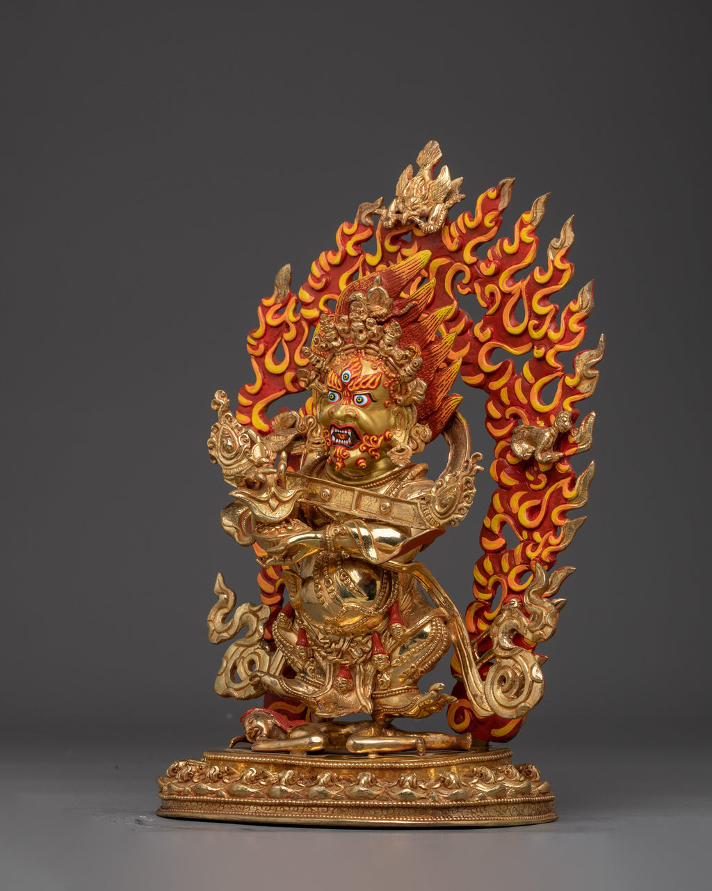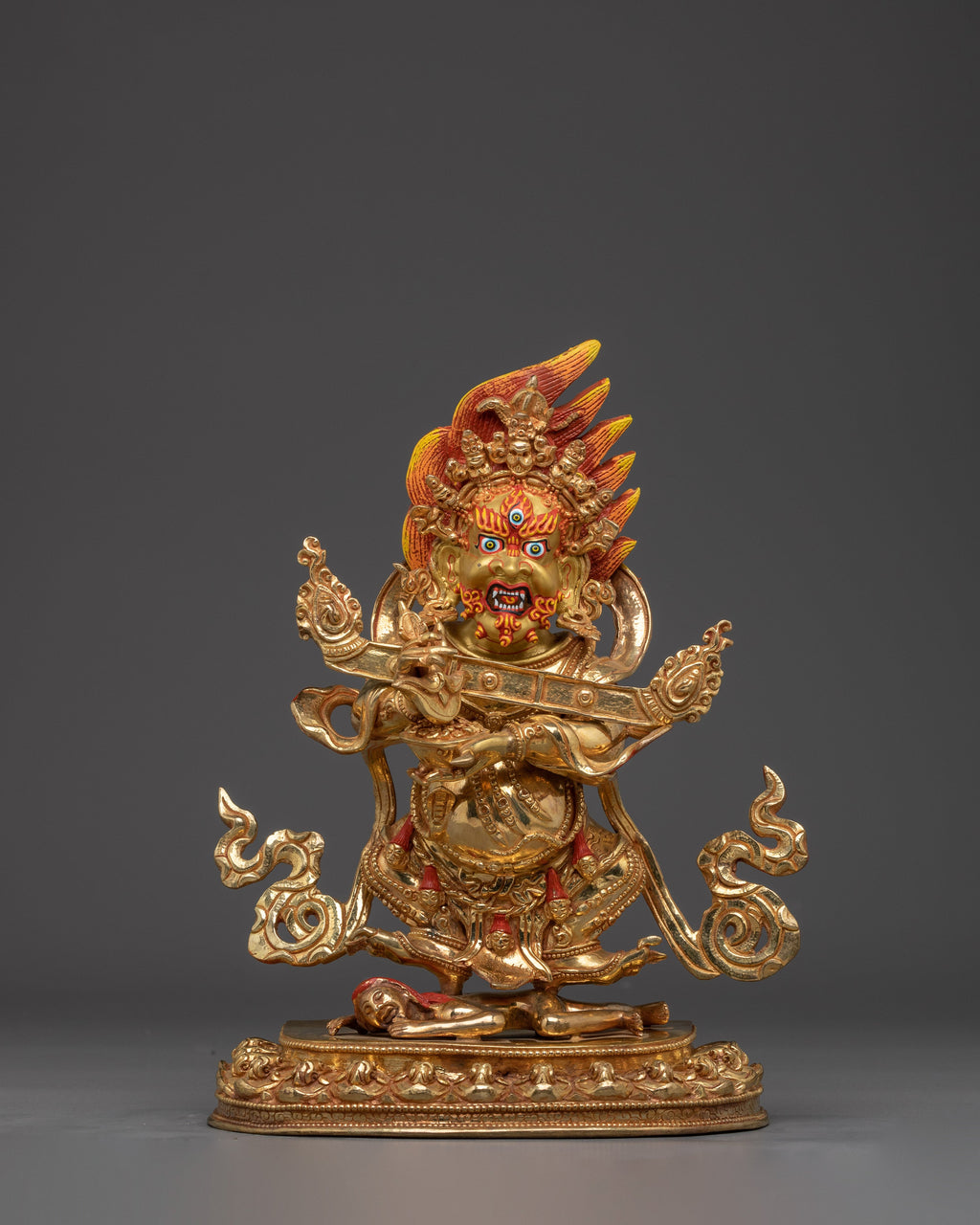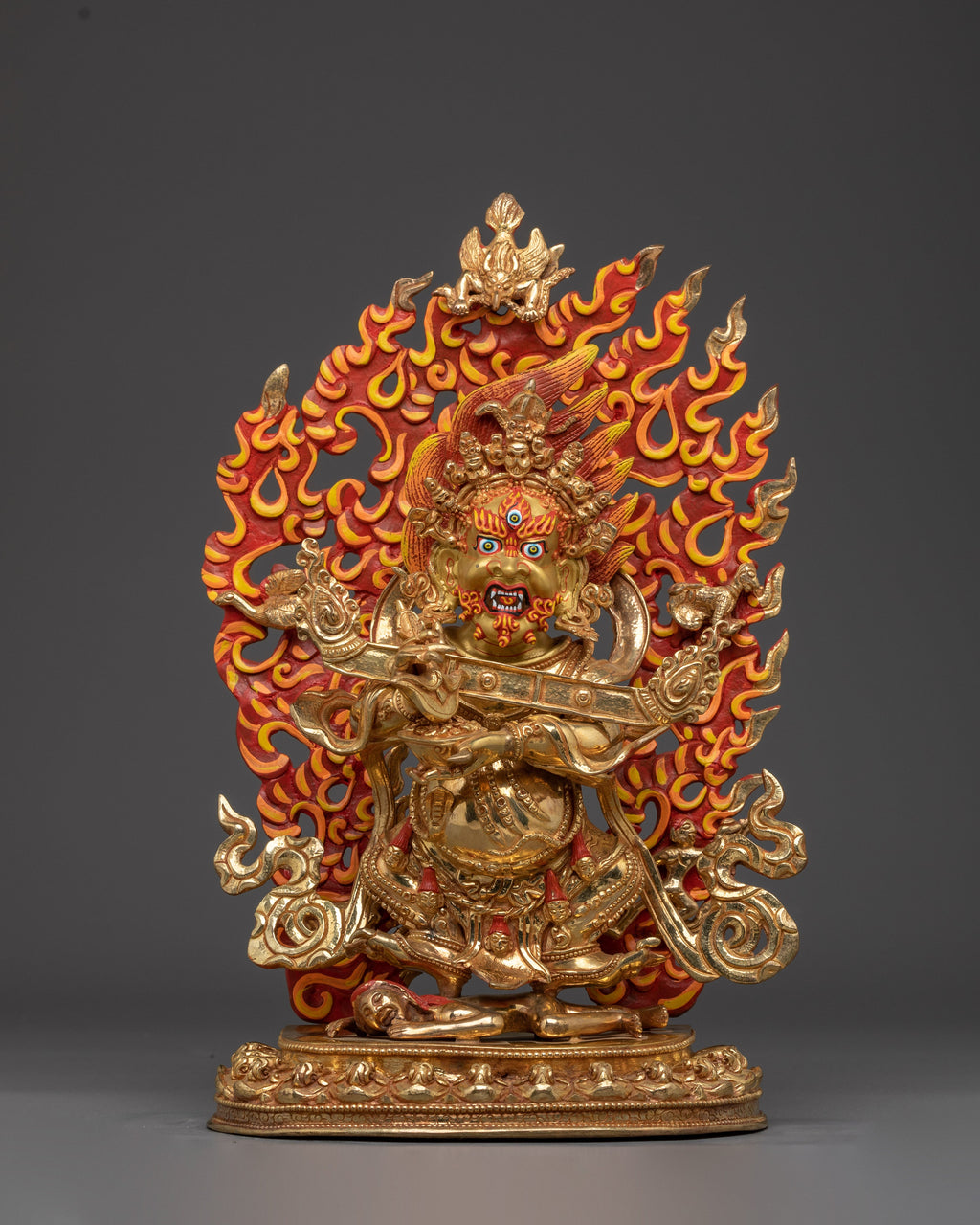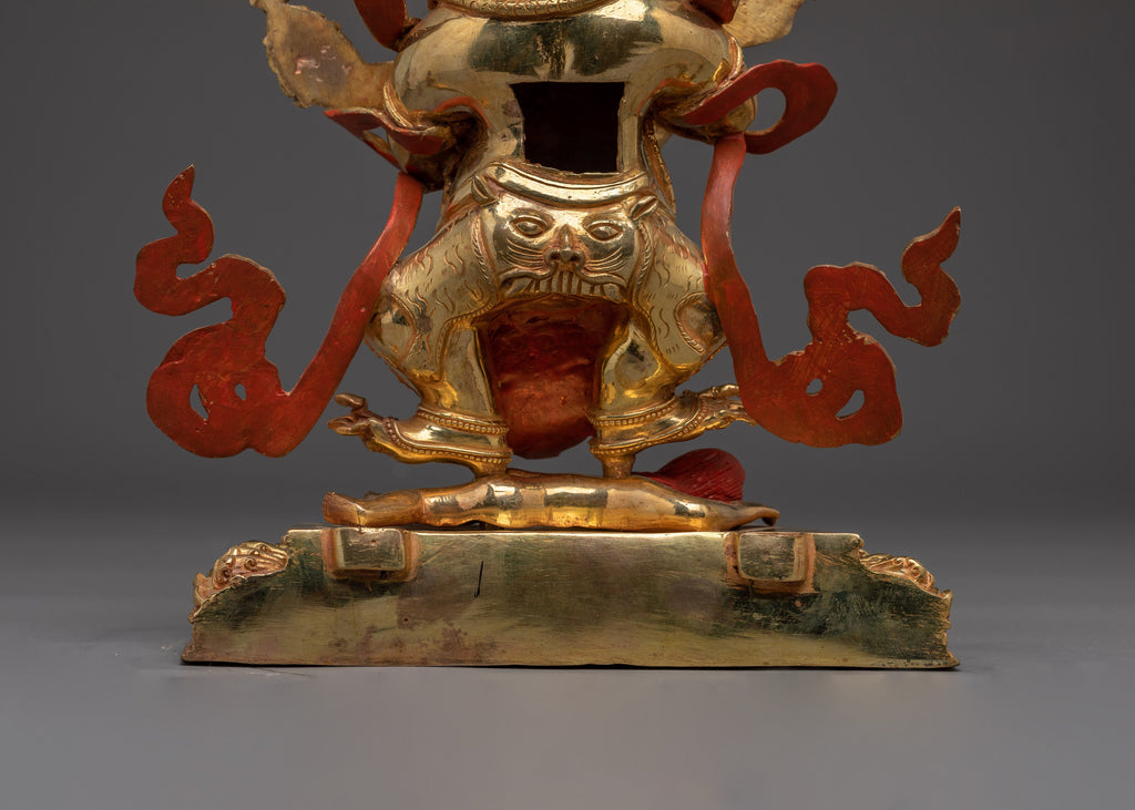 Wrathful Compassion Deity Sakya Mahakala stands 13.6” (34.5 cm) tall with a 7.9” (20 cm) base and weighs 4.21 kg. Handcrafted from copper, 24K gold gilding, and gold and acrylic paintings, the statue captures the dynamic energy of this wrathful protector deity. Revered in the Sakya tradition of Tibetan Buddhism, Mahakala is a fierce manifestation of Avalokiteshvara, embodying a compassionate force that removes spiritual obstacles and safeguards practitioners on their path. The intricate detailing and vibrant finish reflect both the sacred symbolism and artistic mastery of Himalayan craftsmanship, making this statue a powerful addition to any shrine or spiritual space.