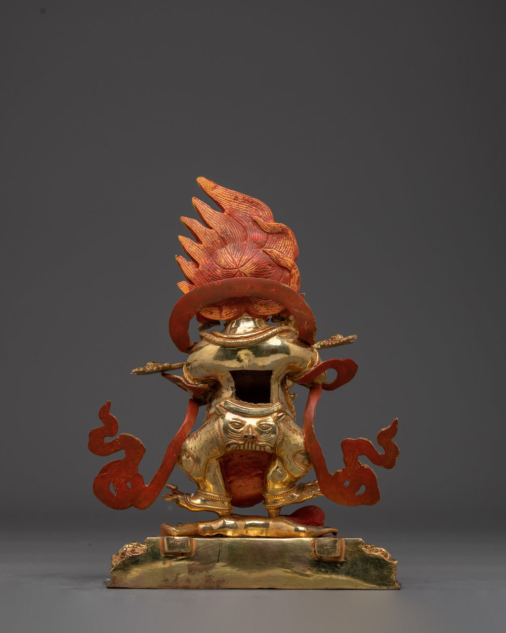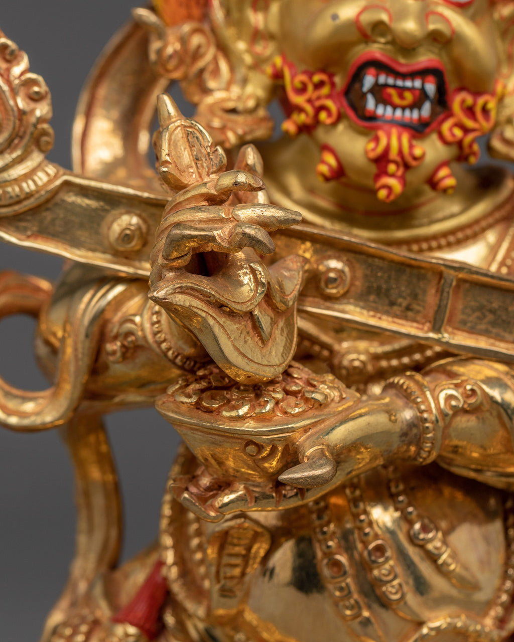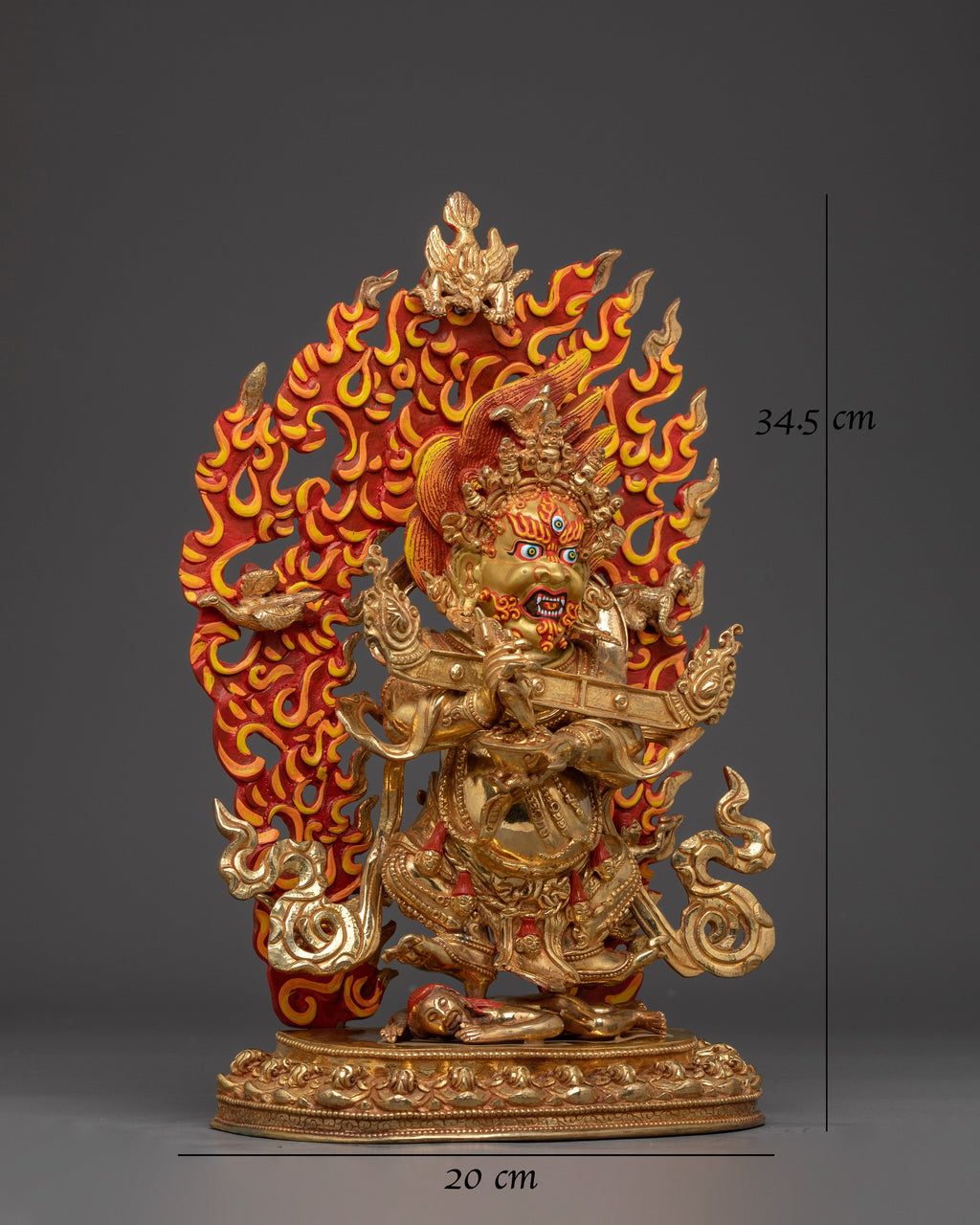 Wrathful Compassion Deity Sakya Mahakala stands 13.6” (34.5 cm) tall with a 7.9” (20 cm) base and weighs 4.21 kg. Handcrafted from copper, 24K gold gilding, and gold and acrylic paintings, the statue captures the dynamic energy of this wrathful protector deity. Revered in the Sakya tradition of Tibetan Buddhism, Mahakala is a fierce manifestation of Avalokiteshvara, embodying a compassionate force that removes spiritual obstacles and safeguards practitioners on their path. The intricate detailing and vibrant finish reflect both the sacred symbolism and artistic mastery of Himalayan craftsmanship, making this statue a powerful addition to any shrine or spiritual space.