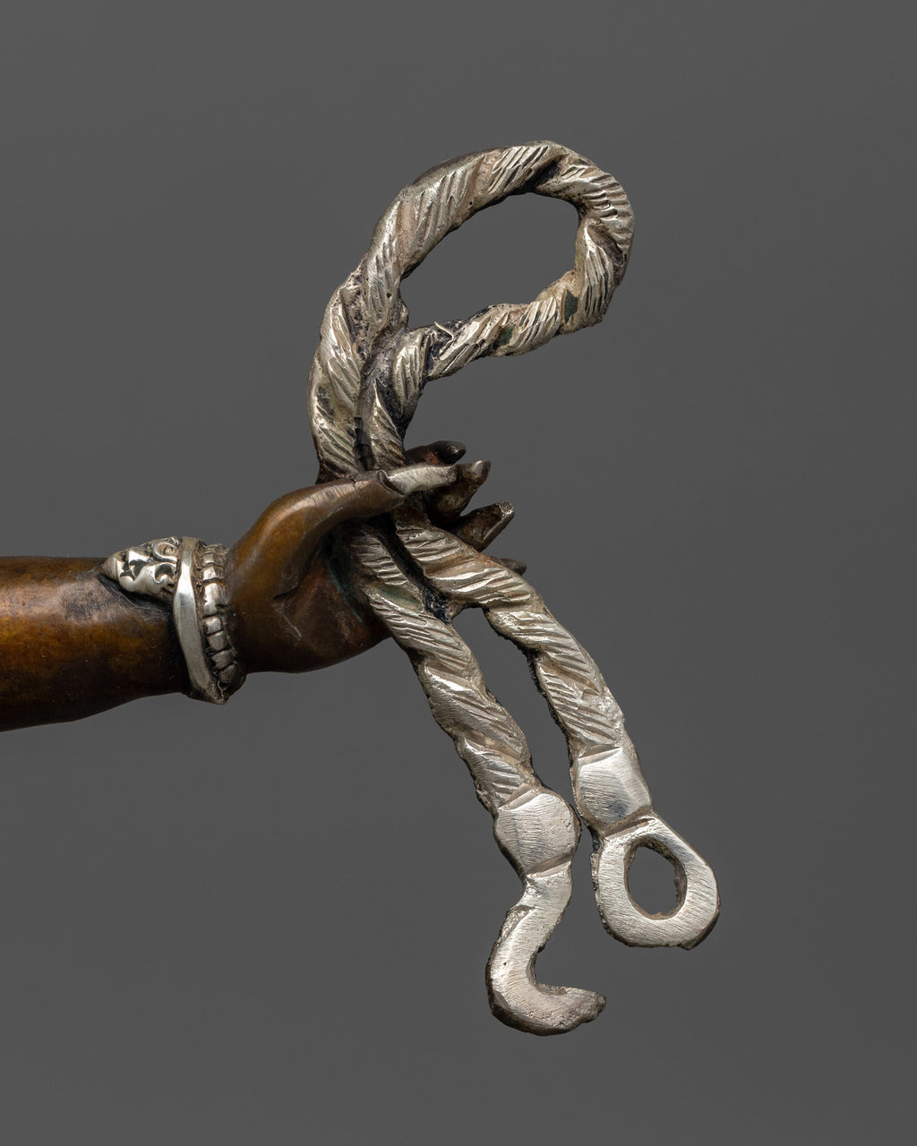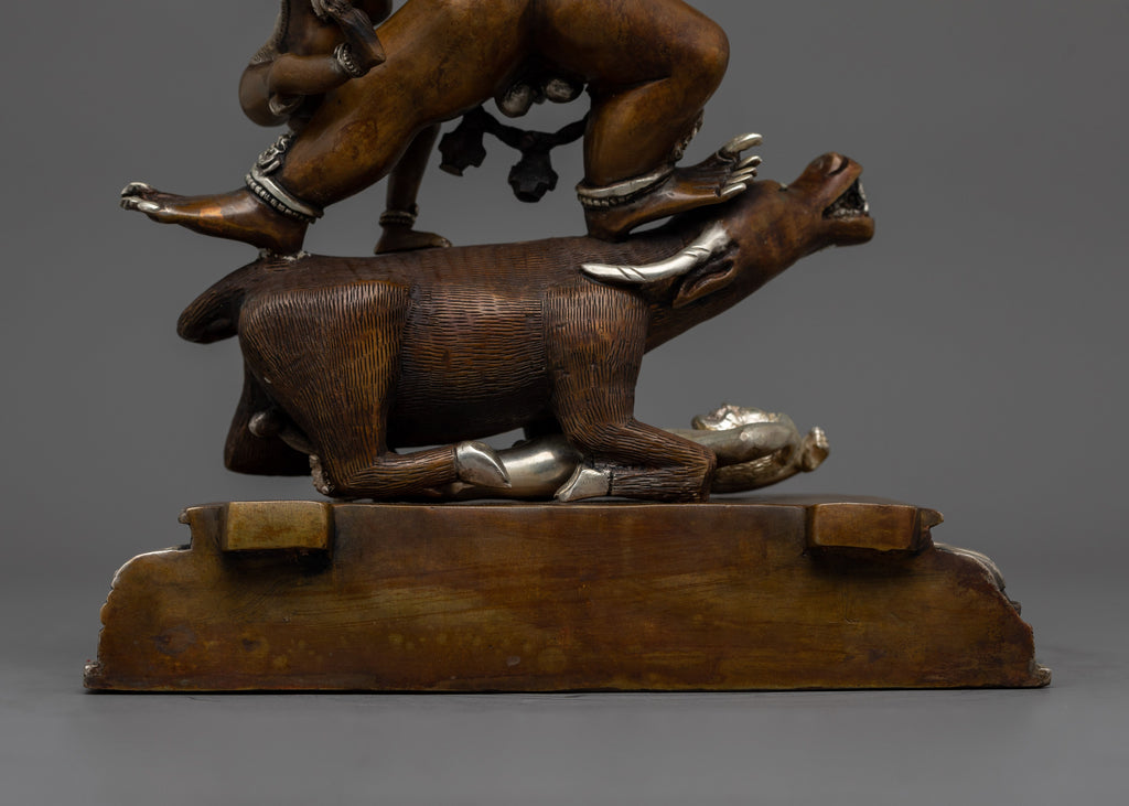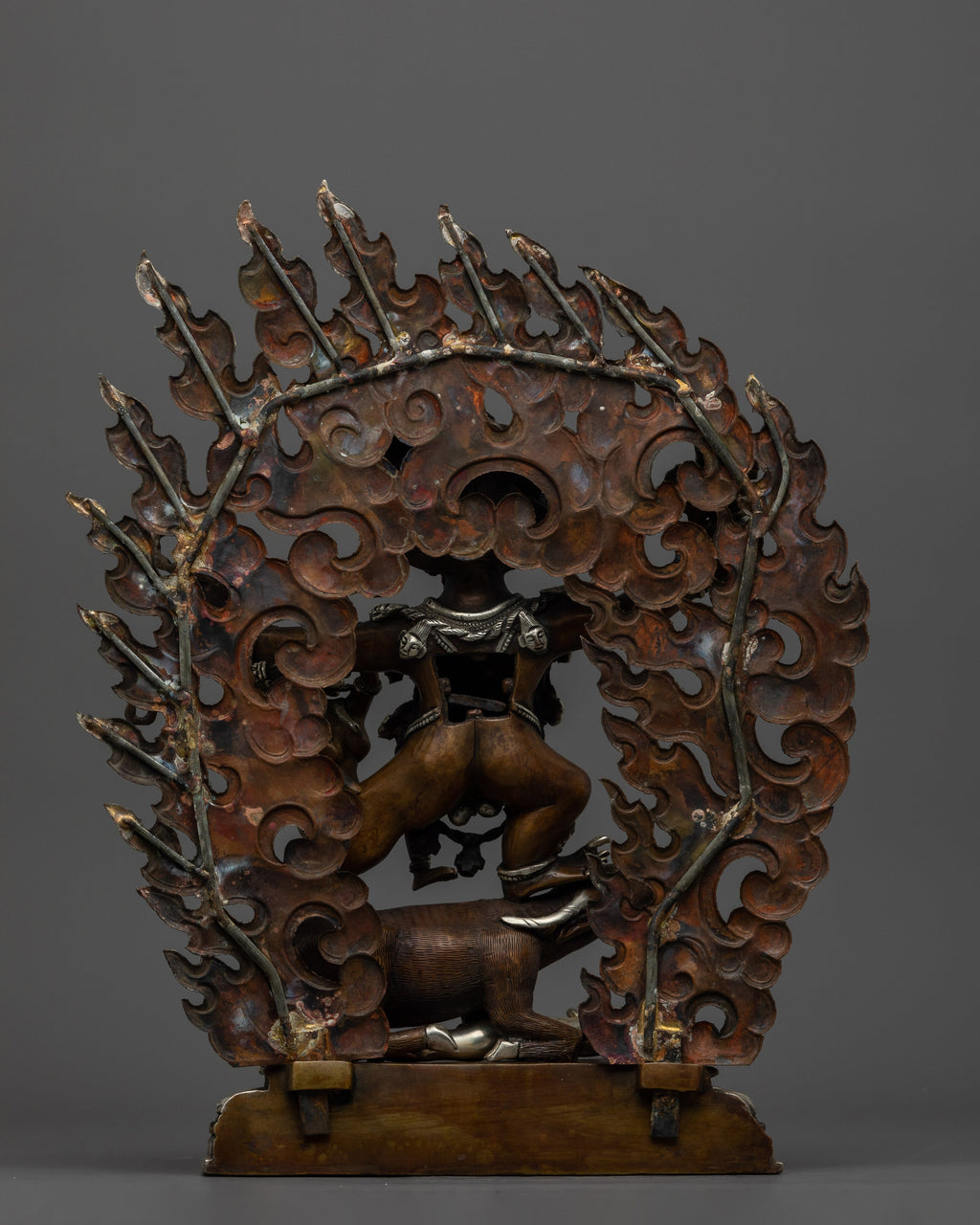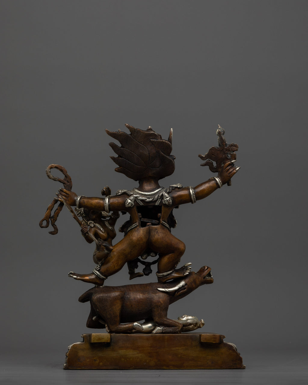 The wrathful deity Dharmaraja Yama statue is a powerful and intricate representation of transformation and protection, standing at 14.8 inches (37.5 cm) in height and 12 inches (30.5 cm) in base width. Crafted from an oxidized copper body, the statue is beautifully silver-plated, giving it a refined and mystical appearance. The detailed design captures Yamantaka’s fierce, protective nature, symbolizing the conquest of inner obstacles and the victory over death.