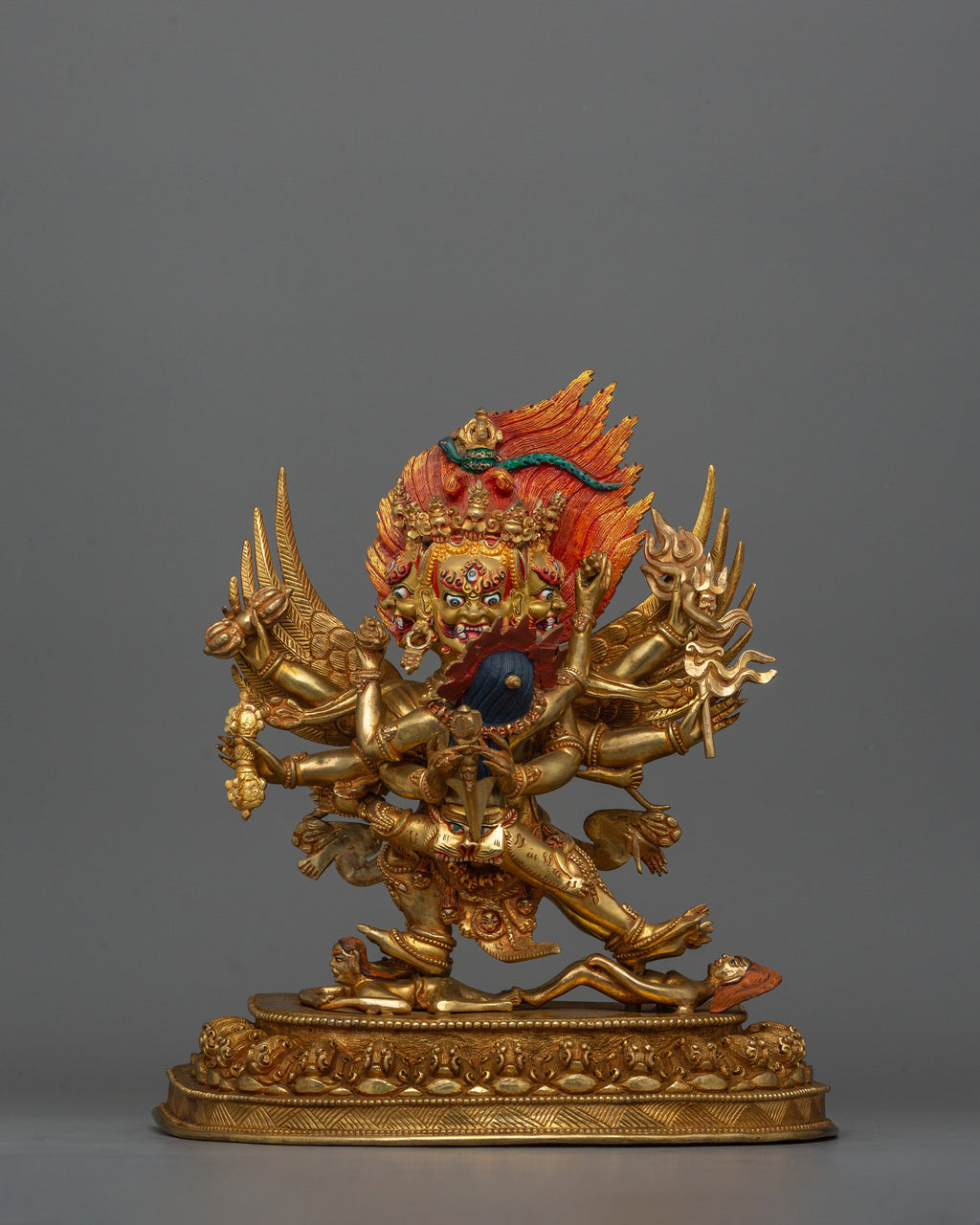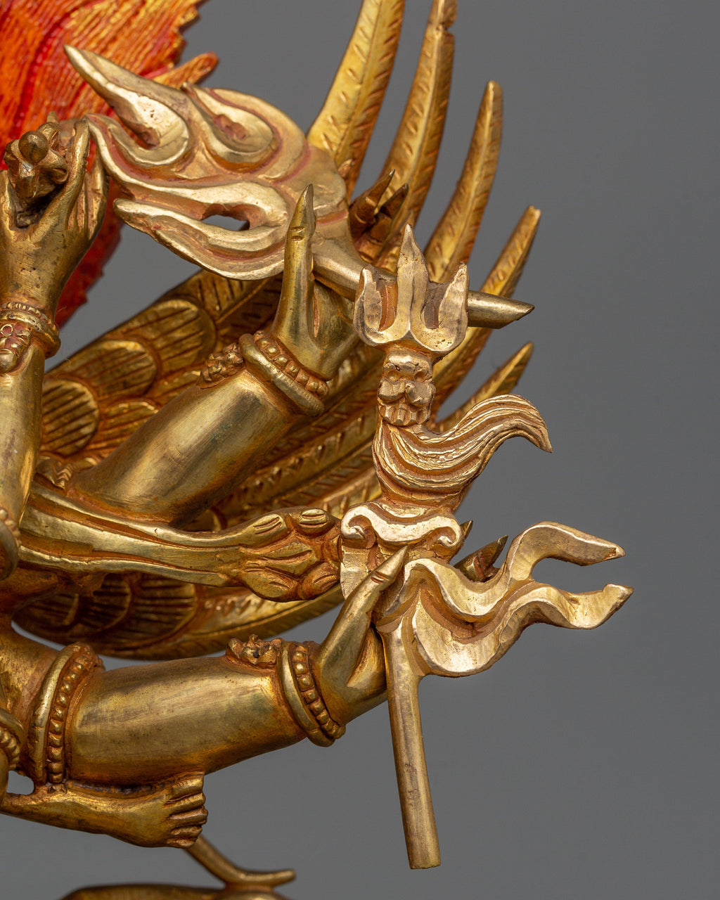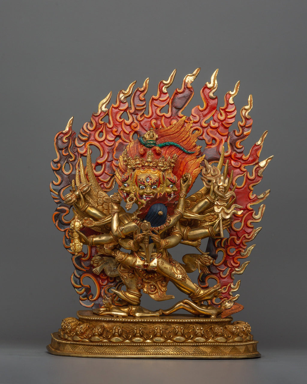 This handcrafted statue embodies the tremendous energy and transforming presence of Vajrakilaya, the Wrathful Deity of Protection. This statue, measuring 14" (Height) x 11" (Base) and weighing 5.82 kg, is made of copper and is gilded with 24K gold. It is further adorned with gold and acrylic paints. This artwork, created by expert Nepalese artisans, symbolizes the profound spiritual importance and creative beauty of Himalayan Buddhism, making it an ideal addition to altars, meditation places, or sacred collections.