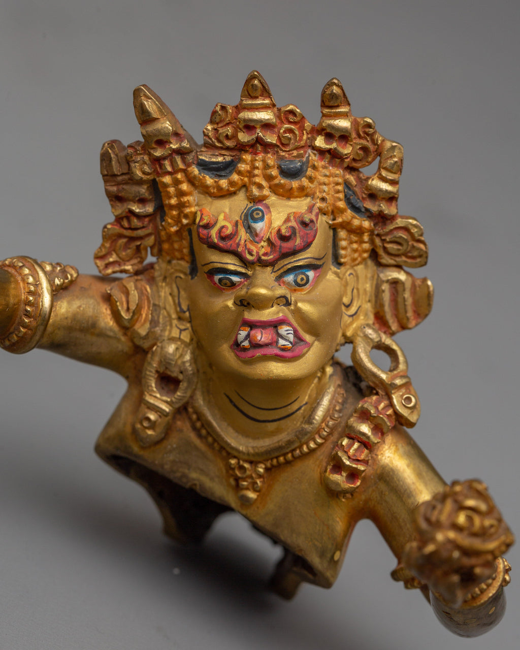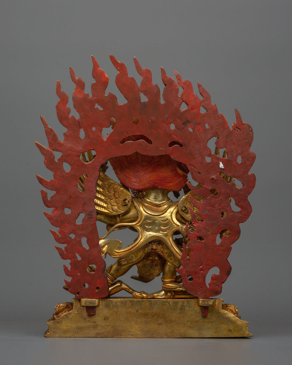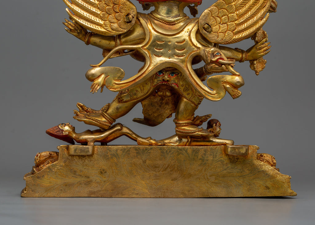 This handcrafted statue embodies the tremendous energy and transforming presence of Vajrakilaya, the Wrathful Deity of Protection. This statue, measuring 14" (Height) x 11" (Base) and weighing 5.82 kg, is made of copper and is gilded with 24K gold. It is further adorned with gold and acrylic paints. This artwork, created by expert Nepalese artisans, symbolizes the profound spiritual importance and creative beauty of Himalayan Buddhism, making it an ideal addition to altars, meditation places, or sacred collections.