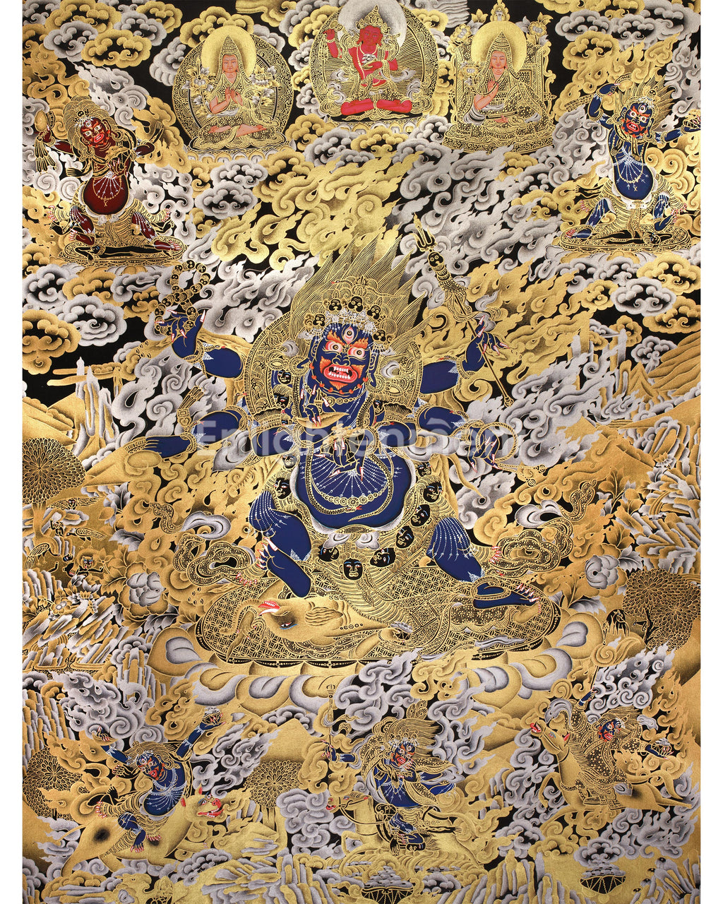 Surrounding Mahakala are Dharma Protectors, divine guardians who enhance his powerful energy. These figures, adorned with intricate gold and silver detailing, are strategically positioned around Mahakala, amplifying the spiritual force of this thangka. The use of 24k gold and silver in this artwork contributes a sense of grandeur and sacredness, making this piece a true masterpiece of Tibetan Buddhist iconography.