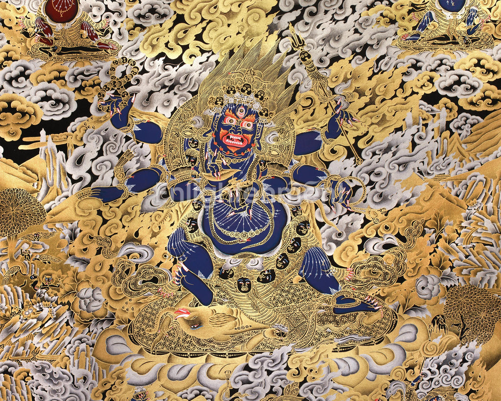 An exquisite thangka that showcases powerful and wrathful Mahakala figure, the protector deity in Tibetan Buddhism. Painted in deep blue, Mahakala is adorned with intricate gold ornaments that emphasize his strength and spiritual authority. His six arms hold symbols of protection: a trident, a sword, a noose, a skull cup, a damaru, and a rosary of skulls, each reflecting his role as a defender against obstacles and negative forces.