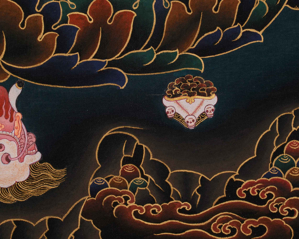 Mahakala Bernagchen is a key protector in the Karma Kagyu lineage, regarded as a compassionate emanation in wrathful form, who removes obstacles and supports Dharma practice. His fierce appearance symbolizes the destruction of ego and ignorance, not aggression. Masters have long invoked him as a guardian of tantric teachings. This thangka depicts Mahakala Bernagchen seated on a lotus and sun disc, symbolizing enlightened activity rooted in wisdom. His dark face with three eyes signifies omniscient awareness of past, present, and future. He wears a crown of five skulls, transforming poisons into wisdom. In his right hand, he holds a curved knife with a vajra handle, cutting ignorance; in his left, a skull cup filled with blood, representing the transmutation of ego and negativity into wisdom nectar. Surrounded by flames of primordial wisdom, his golden figure stands against a black background, emphasizing its sacredness. This Nakthang masterwork supports protector practice and meditation—invoking this guardian boosts spiritual protection, courage, and resolve.