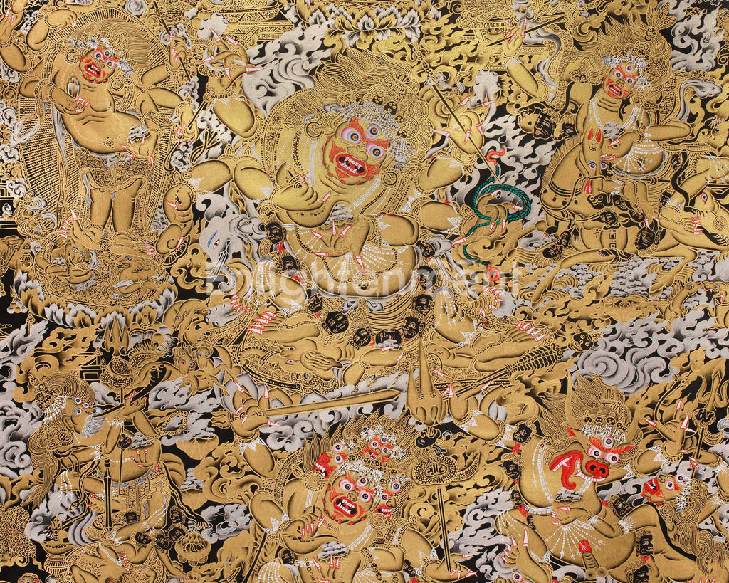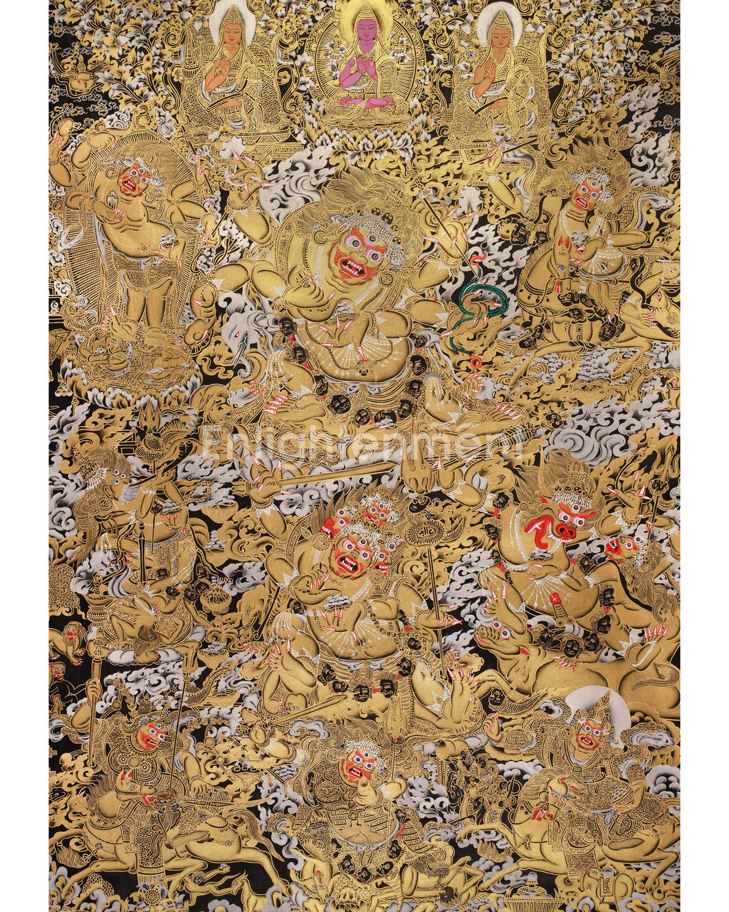 Surrounding Mahakala are other formidable Dharma protectors, including the serene White Mahakala and the powerful Palden Lhamo. Yama, the Lord of Death, and Mahakala, with his four heads, along with a Maha Siddha below him, contribute to the dramatic intensity of the artwork. At the apex of the Thangka, the Buddhist master Je Tsongkhapa and his disciples are depicted, guiding the spiritual practitioners.