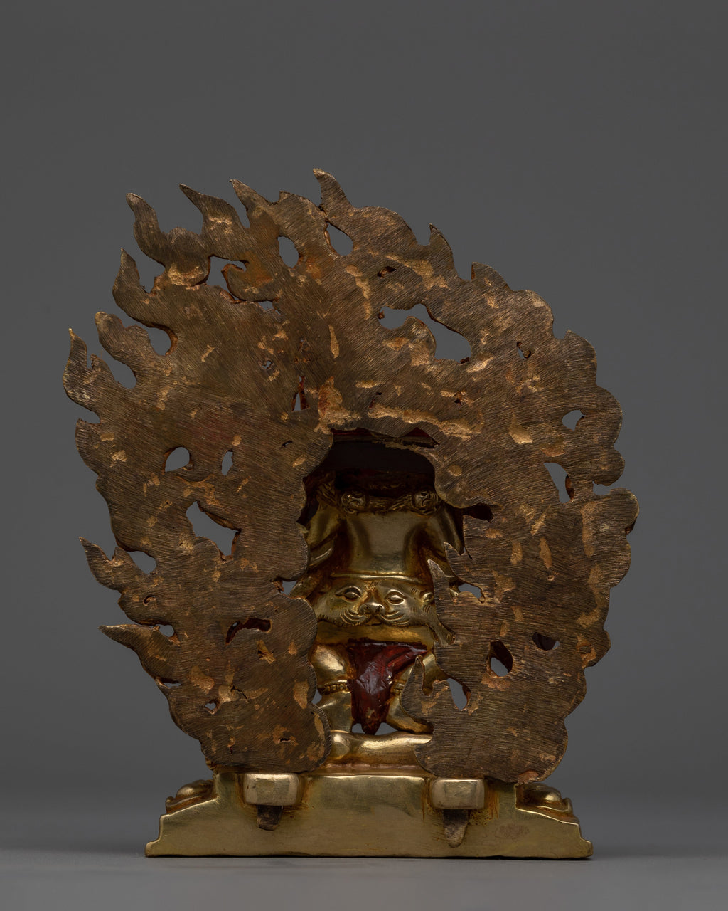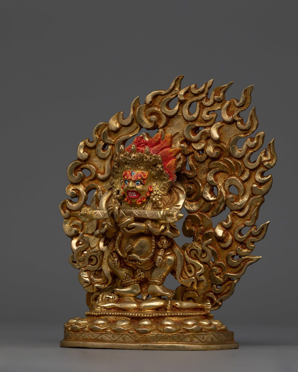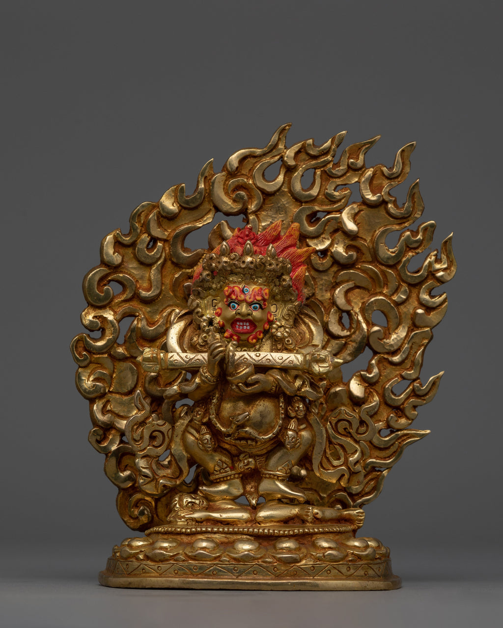 Sakya Mahakala is depicted standing on the top of a sun disc lotus seat with a wrathful expression. He holds a kartrika (flaying knife) in his right hand while carrying a kapala (skull cup) in his left hand, and the encircled fire flame engulfs his presence. The Nepali craftsman has finely detailed handcrafted the robe and the ornaments. This sculpture will be a tremendous gift from Nepal to a practitioner like you, representing his ability to consume negativity and ignorance.