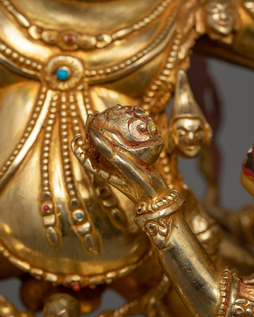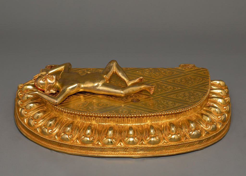 The Yama Dharmaraja "Vajrabhairava" Statue, revered in Vajrayana Buddhism, represents the transformational power of wrathful compassion in overcoming barriers and ignorance. This hand-carved statue, measuring 18.9" (height) x 13.4" (base) and weighing 10.77 kg, is made of copper, covered with 24K gold gilding. This sculpture, adorned with gemstones, handcrafted by expert Nepalese artisans, elegantly symbolizes Himalayan Buddhism's sacred traditions, making it an appropriate addition to altars, meditation places, or sacred collections.