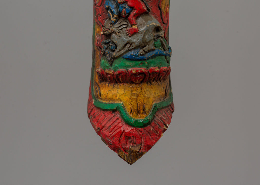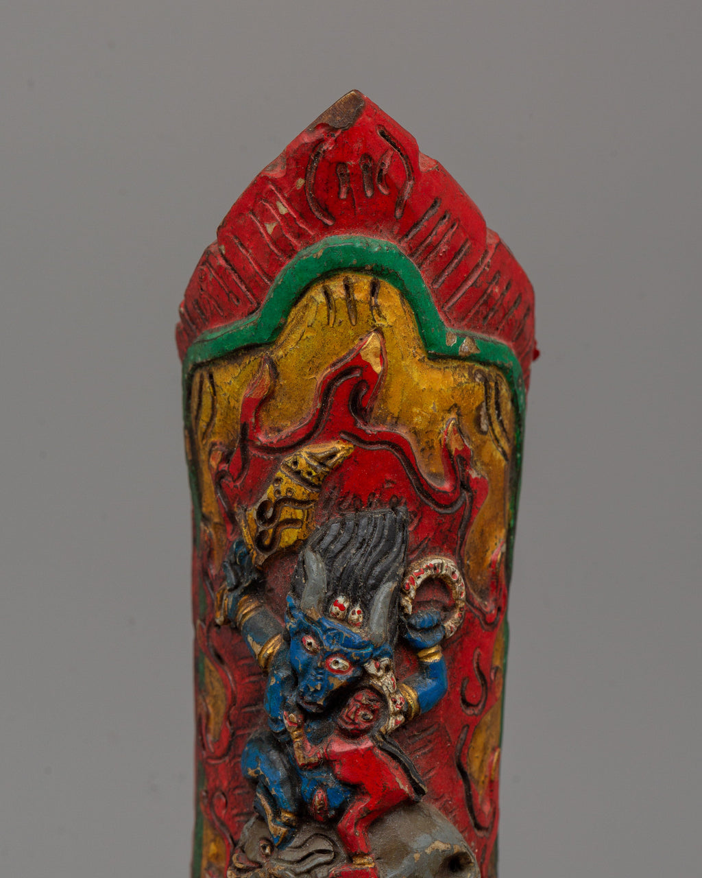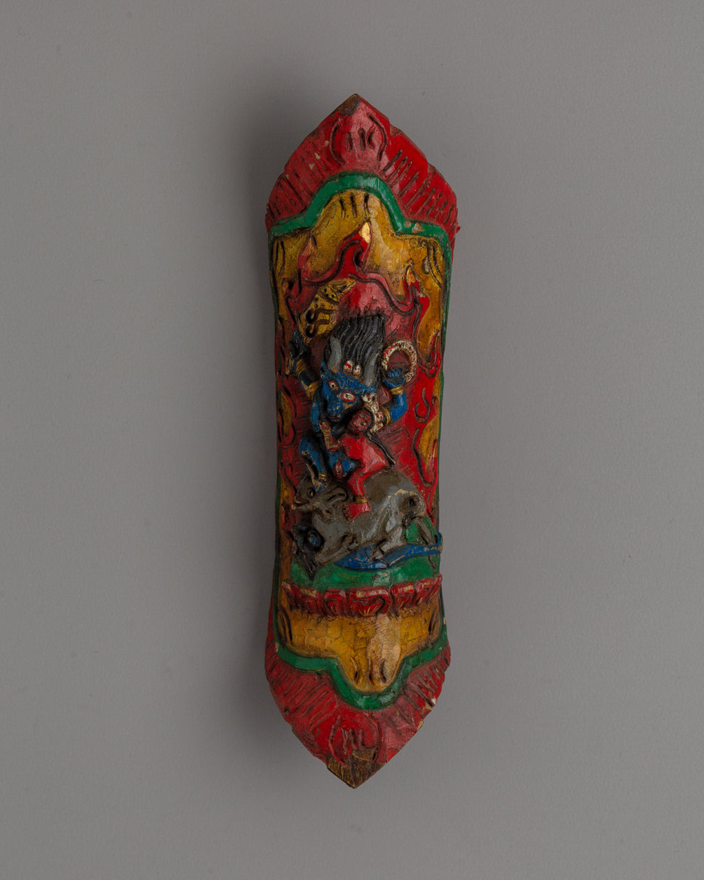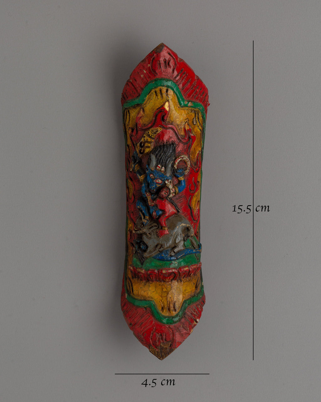 This Yamantaka apron decoration, which features the deity surrounded by fire transformational force, is expertly carved by Himalayan artists in every detail. The striking artwork, hand-painted with colorful acrylics, guarantees longevity and aesthetic appeal. This one-of-a-kind item reflects the rich cultural legacy and devotion of Tibetan art, whether utilized for Buddhist ceremonies, meditation exercises, or as an effective supplement to spiritual attire.