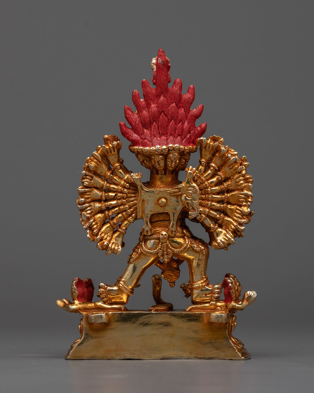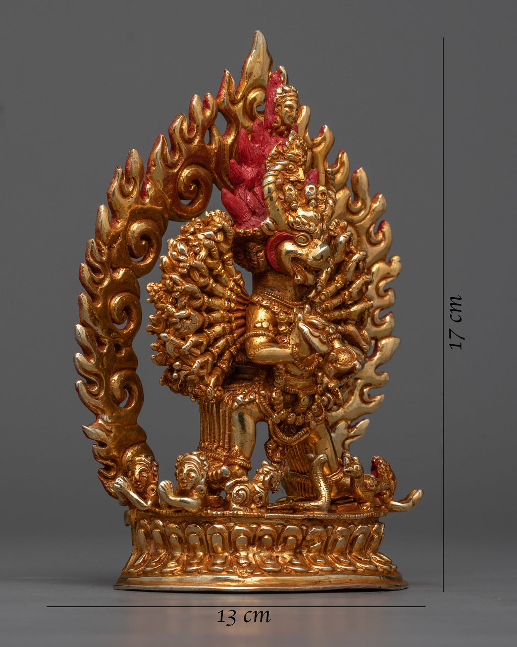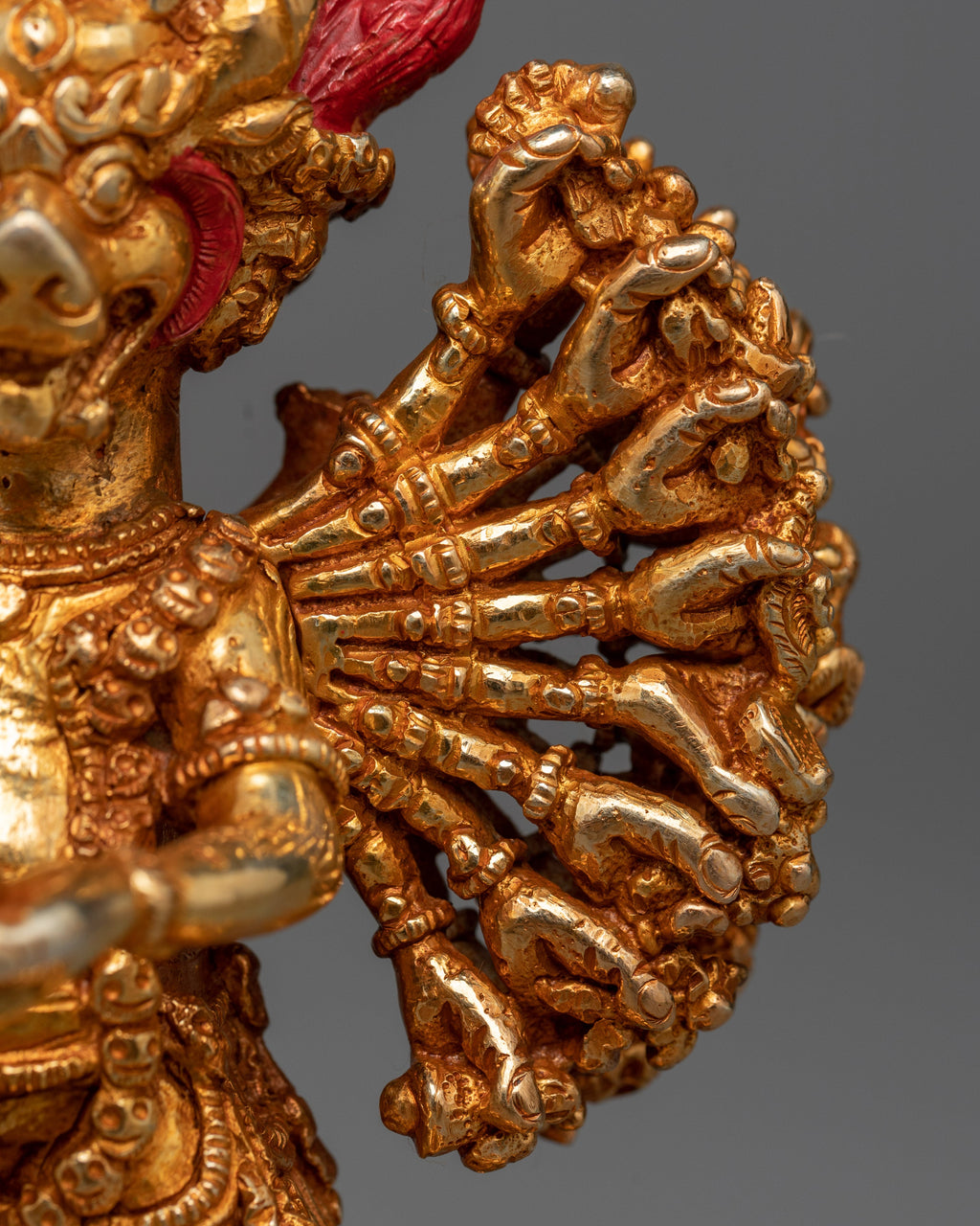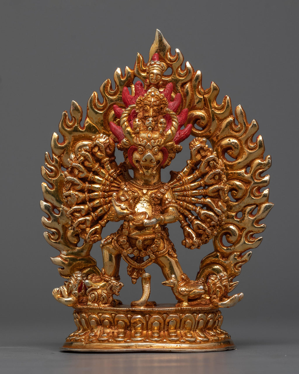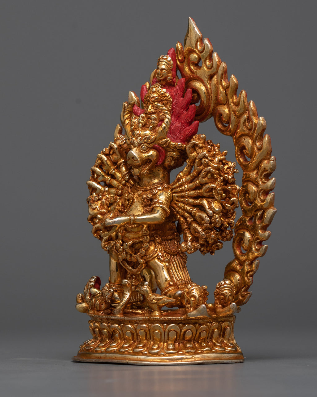Yamantaka's powerful and dynamic shape is captured in the elaborate design of the statue, a demonstration of ultimate power over death and negativity. The 24K gold gilding not only provides a touch of beauty but also symbolizes the spiritual meaning of the statue, symbolizing the triumph of light over darkness and wisdom over ignorance. This representation of Yamantaka serves as a potent reminder of the impermanence of life and the transformative power of enlightenment.