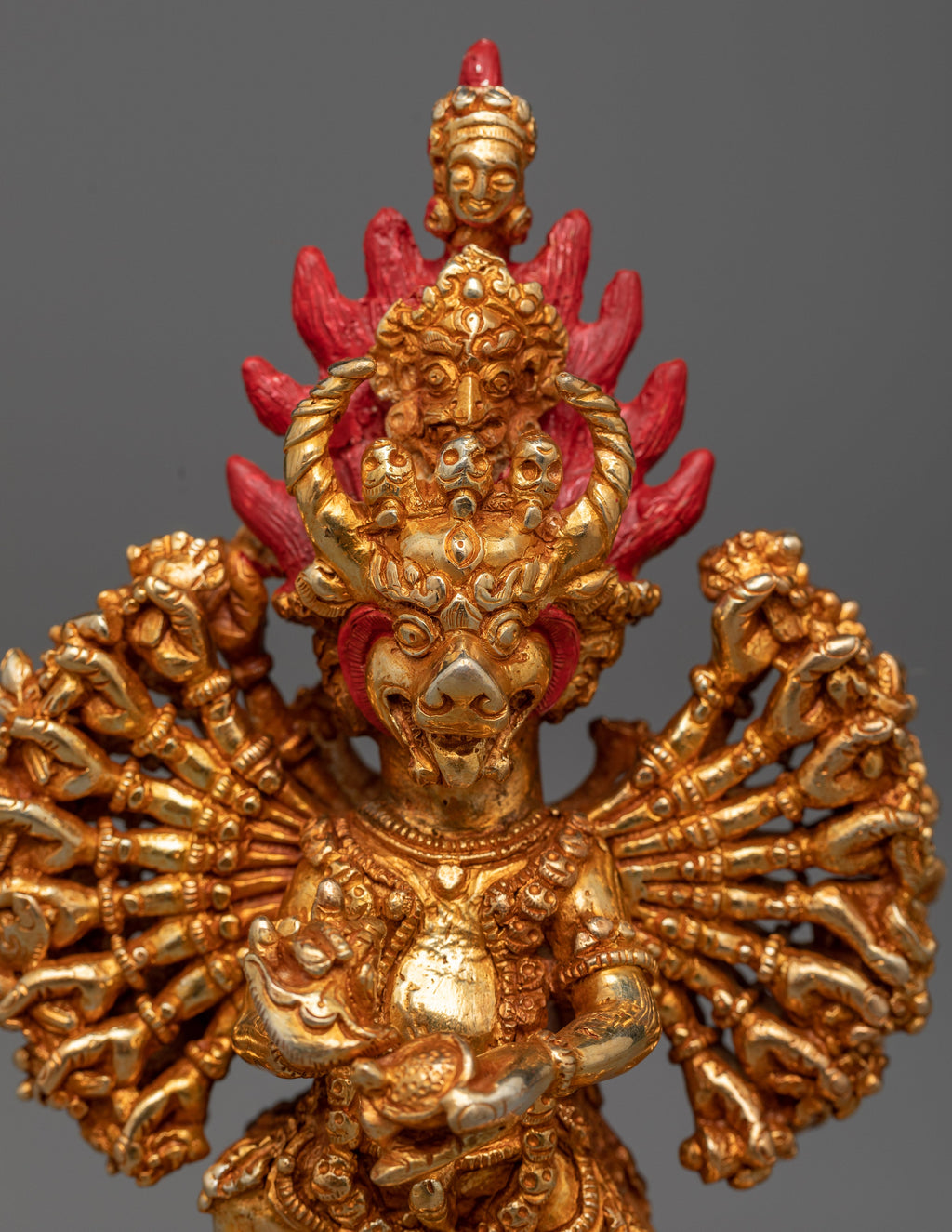 Through our beautifully created statue, infuse your area with the vital energy of Yamantaka Deity, the conqueror of death. This piece symbolizes the height of Nepalese craftsmanship, crafted from a copper body and exquisitely decorated with 24K gold plating. The Yamantaka deity statue, despite its tiny stature, is influential in symbolism and presence, making it an excellent addition to any meditation or spiritual environment.
