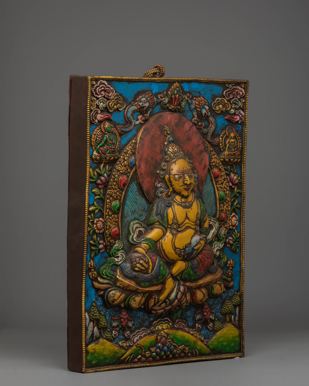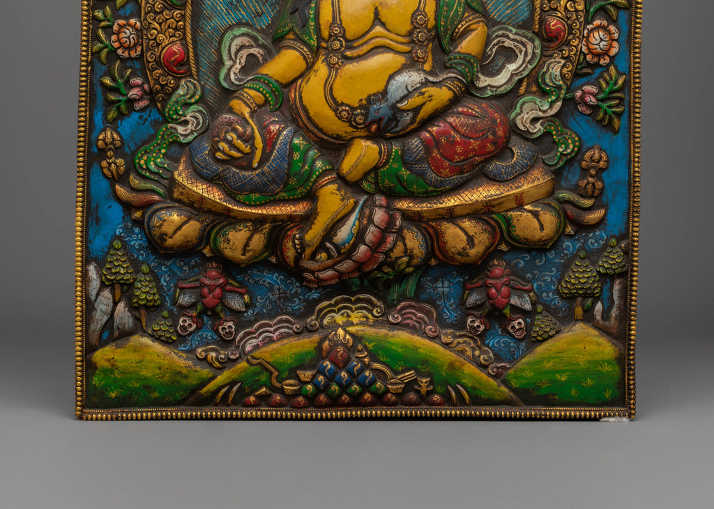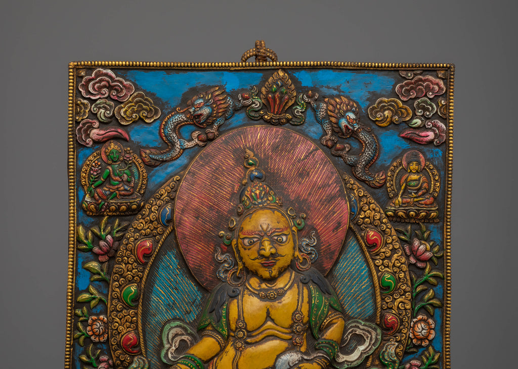 The Yellow Dzambhala Wall Hanging is a captivating Tibetan art piece featuring the wealth deity Dzambhala, along with important figures in Tibetan Buddhist, such as Shakyamuni Buddha and Green Tara. Crafted with a copper body and adorned with vibrant acrylic colors, the wall hanging is enhanced with coral and turquoise stones, symbolizing vitality, protection, and spiritual energy. This piece, measuring 54 cm in height and 35 cm in width, brings both beauty and profound meaning to any space.