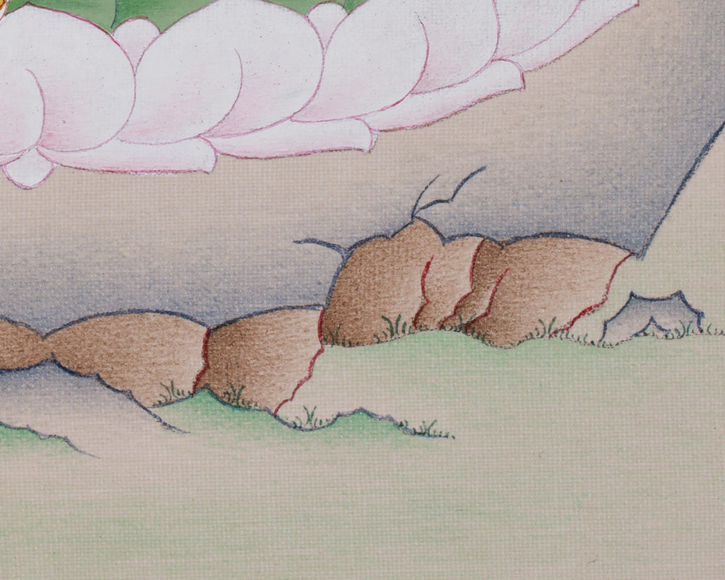 The Yeshe Tsogyal artwork features a divine presence, created on cotton canvas with natural stone colors and 24K gold. Made in the traditional Karma Gadri style, it showcases intricate detailing along with a peaceful yet commanding composition, symbolizing her wisdom and compassion. The use of natural stone colors combined with gold accentuates her luminous beauty, rendering this thangka a timeless piece of spiritual artistry.