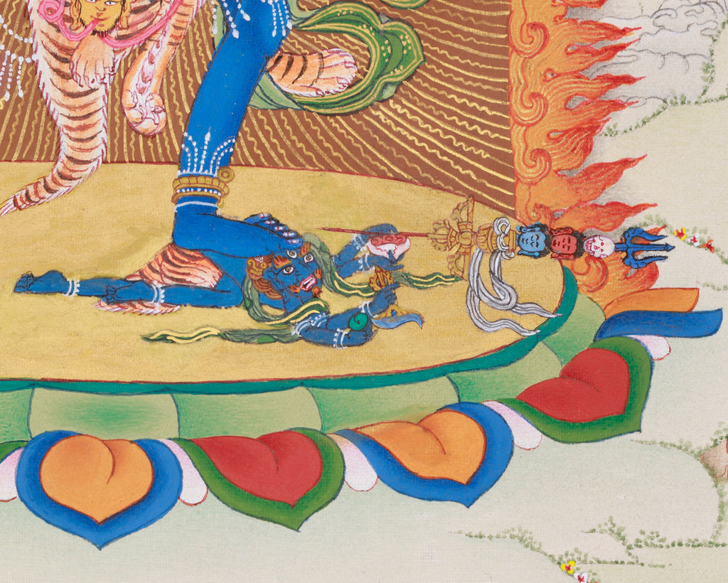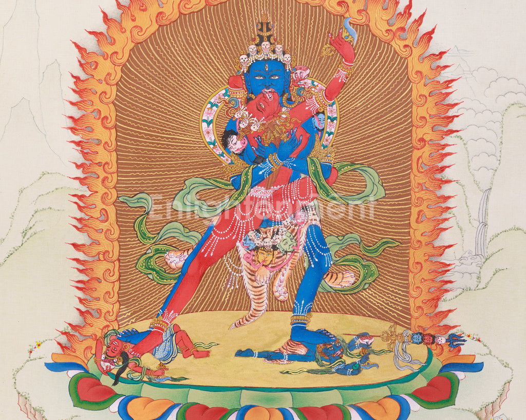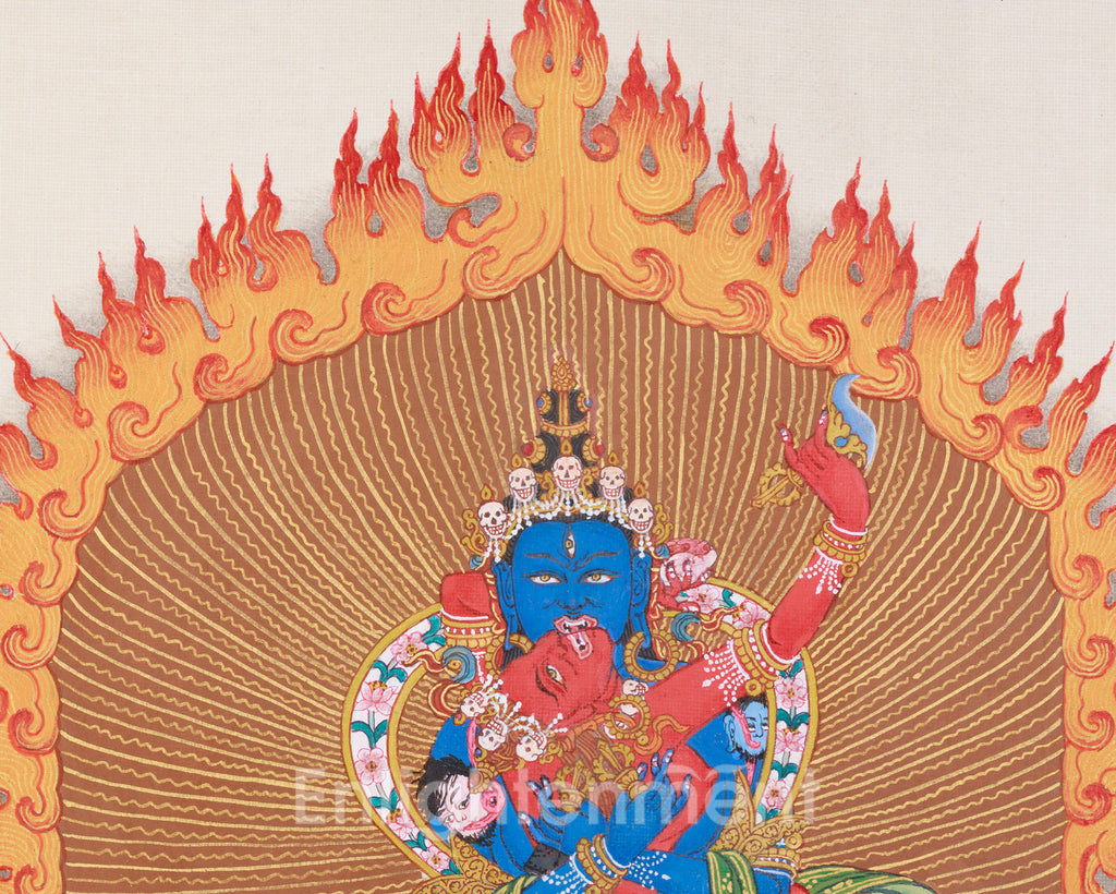 This thangka features Yidam Chakrasamvara in Yab-Yum with Vajravarahi, illustrating the harmony of method and wisdom. His blue body signifies compassion and infinity, while he holds the vajra and bell to symbolize skillful means and wisdom. Vajravarahi holds a curved knife and skull cup, symbolizing cutting ignorance and transforming suffering. Adorned with a five-skull crown and surrounded by flames, he stands on a lotus and sun disc, signifying triumph over illusion and awakening. Golden highlights and detailed lines reflect spiritual meaning and artistry. Invite this thangka into your space to foster balance, clarity, and enlightenment.