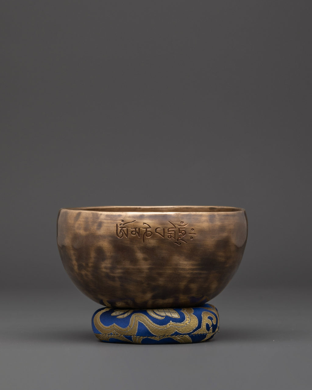 The bowl features subtly engraved Tibetan mantras, each symbolizing compassion, balance, and spiritual clarity. Its beautifully burnished surface highlights traditional Himalayan craftsmanship, while the resonant sound tones echo centuries-old meditation practices. Made from copper, tin, zinc, iron, and silver, the five-metal composition represents the harmony of the five elements — Earth, Water, Fire, Air, and Space — believed to create a balanced flow of healing energy. The silk cushion beneath adds stability and elegance, ensuring clear, sustained tones during each meditation session.